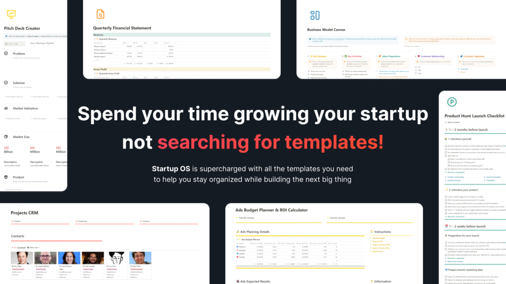 The product Startup OS itself is a comprehensive tool for all aspects of your startup. It prepares you for your entire startup journey from idea generation to graduating into an established business with templates like Product Hunt launch checklist, OKRs, feature comparison tables, and much more.”
